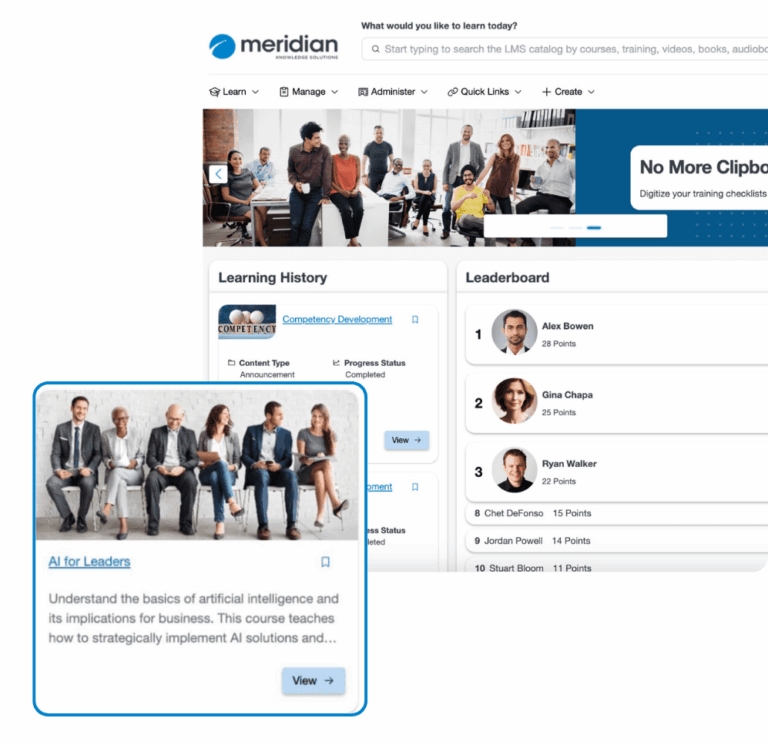 Meridian LMS provides learners with an intuitive, engaging experience through curated learning paths, progress tracking, and mobile-friendly access. It empowers learners to take control of their development while making it easy for administrators to manage training.